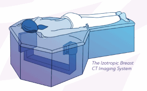 Izotropic Corporation (OTCQB: IZOZF / CSE: IZO / FSE: 1R3) is a company offering a new technology called IzoView breast CT system. IzoView is a technology that is expected to produce high-resolution breast images in true 3D with a radiation dose less comparable to 2D mammography. This is far more superior for imaging patients with dense breast tissue. A single 10-second scan acquires approximately 500 images without painful breast compression or continual technician breast handling, providing a more comfortable patient experience.[14][15]