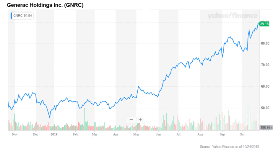 GNRC isn’t cheap. The stock had a big run-up with the recent massive power shut-down in California, but has since pulled back part of the way.