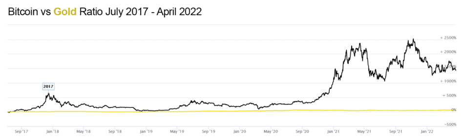 For me, this chart demonstrates two things. The first is that gold remains relatively flat throughout this period. The second is that Bitcoin price rises don’t seem to have any real correlation with gold prices. This also seems to hold true when we zoom out.