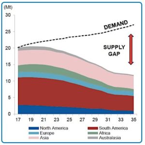 Supply of copper from new projects will peak, and will fall away dramatically as we move towards 2020. Bloomberg still sees the possibility of expanded production from existing mines, but after 2020 there really is no more flexibility.