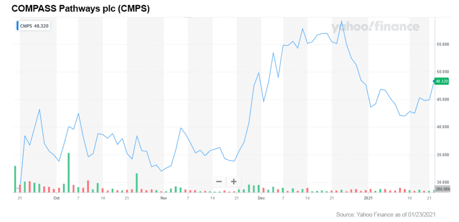This stands in sharp contrast to one of the high flyers in the psychedelics space, COMPASS Pathways plc (NASDAQ: CMPS). The company completed its IPO in November 2020 and has gone from $17 to an impressive $48, with a market cap of approximately $1.599 billion. The company has done well enough that it landed on numerous stock watch lists — but is it justified?