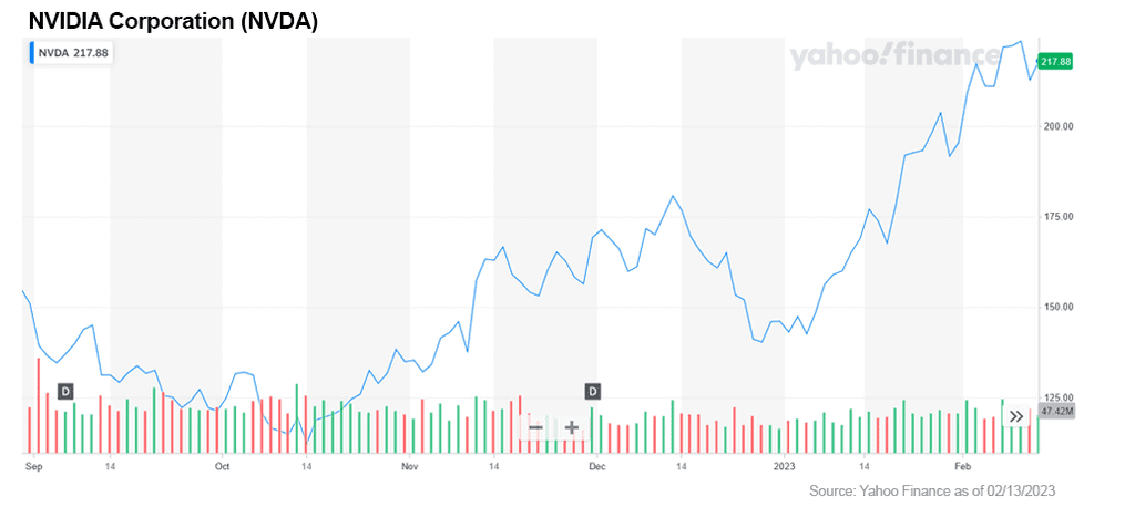 Nvidia stock is up over 4% over the past six months, closing Monday, February 13, 2023 at $217.88. If you had followed my recommendation when I first called out this company back on February 3, 2019 when the stock was trading at $37.04, you would be up an impressive +488% to date.
