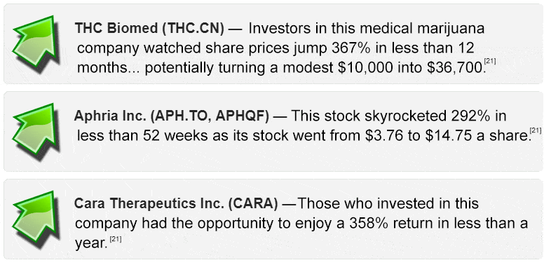 [21] THC.CN: June 1, 2107 $0.40 > Jan 1, 2018 $1.87 = 367.5%, APH.TO, APHQF: Dec 1, 2016 $3.76 > Dec 1, 2017 $14.75 = 292%, CARA: July 11, 2016 $4.94 > June 19, 2017 $22.65 = 358.5%