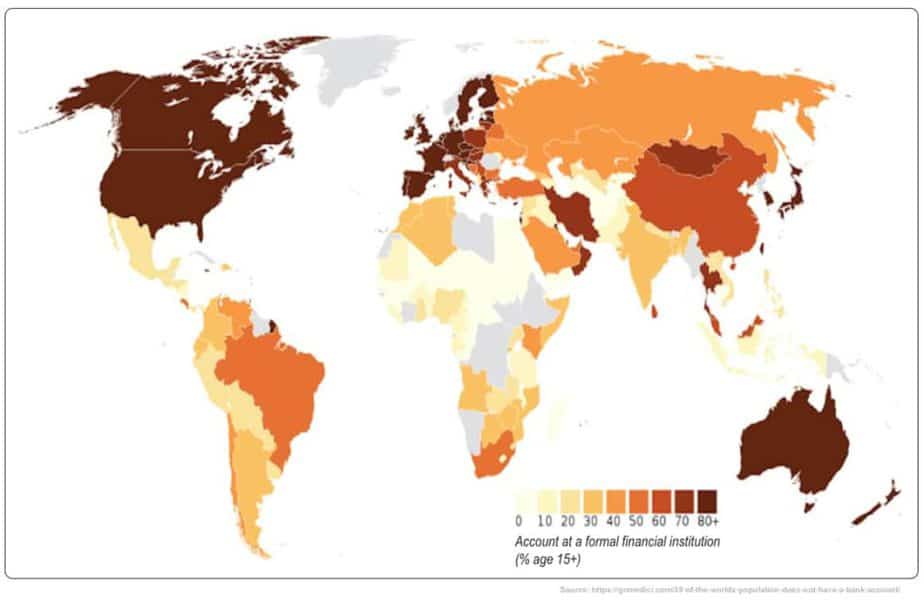 The world map below shows the lack of bank accounts in second and third world countries: