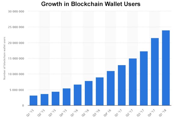Now we are in the early stages of exactly this type of quantum leap in how we will store currency and transact payments. As of November 2018, the combined market cap of all cryptocurrencies hit $184 billion.[1] The current number of blockchain wallet users globally as of 1st quarter 2018 is estimated to be just under 24 million users.[2] As you can see in the chart below, this growth has been exponential in the last couple of years.[3]
