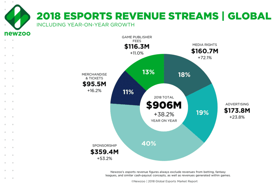 There is tremendous money to be made in all facets of the industry but Newzoo, a research analytics firm specializing in gaming and esports, reports that sponsorship is the biggest moneymaker, accounting for almost 40% of esports’ total revenue.