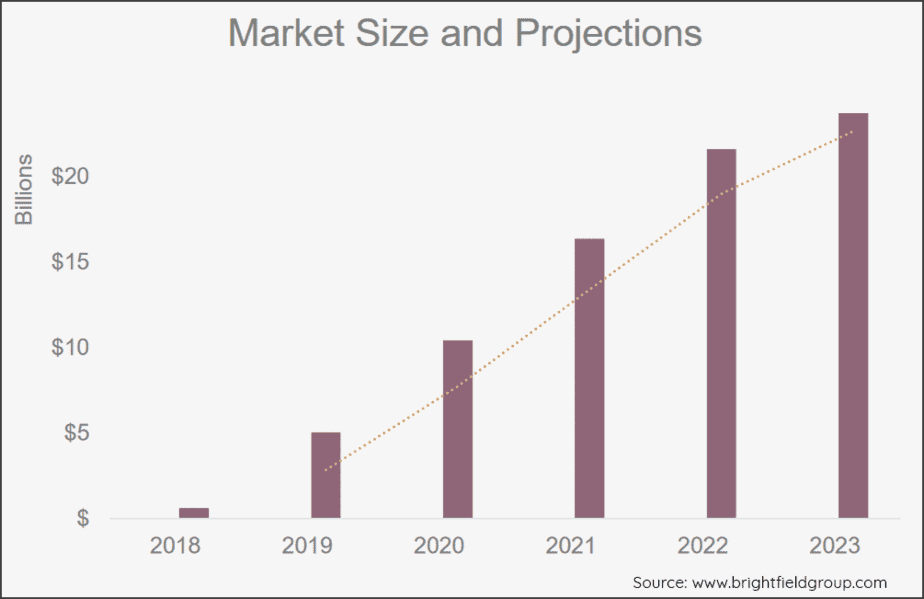 In a newly released report from Brightfield Group, year-over-year CBD product sales growth in the United States could be as high as 706% in 2019 to around $5 billion, and sales of $23.7 billion by 2023.[9]