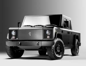The Bollinger electric pickup is in a word, utilitarian. The design is bare bones military. Specs are average in the category with tow loads of 7500 lbs., 0-60 time at 4.5 seconds and the lowest range per charge with only 200 miles.