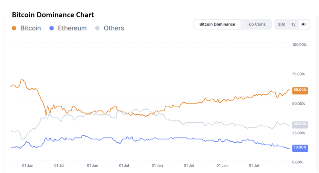 Bitcoin has been the standout performer in this cycle so far. It has consistently outperformed alt coins, and BTC Dominance remains relatively high, hovering at around 60% of the total crypto market cap.