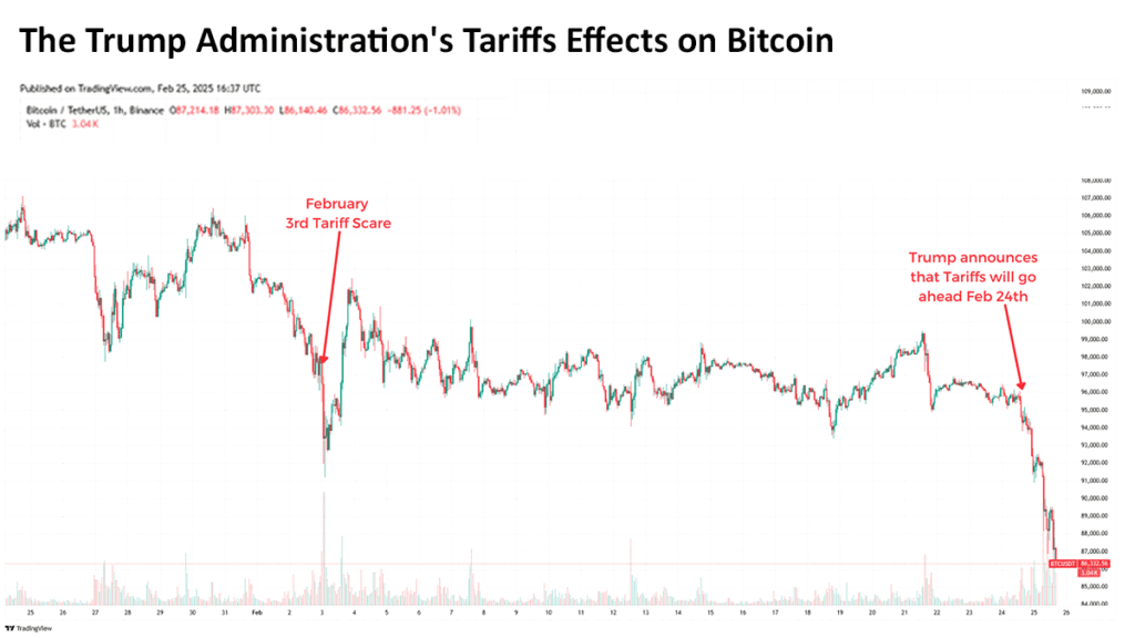 On February 24, 2025, this scenario played out again. President Trump stated that his planned tariffs will go forward, and risk assets like crypto reacted accordingly. The crash isn’t entirely due to tariffs, but rather a general feeling of instability caused by the administration’s policies.