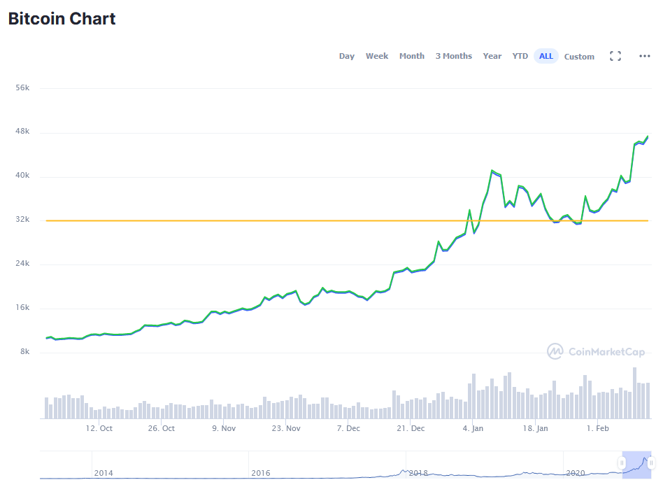 In early February, electric car manufacturer Tesla announced that it would be accepting payment in BTC, and that it had purchased around $1.5 billion worth of Bitcoin.[10] This announcement had an immediate positive effect on the price of BTC, sending it up to a new all time high of $47,000 on the day of the news.