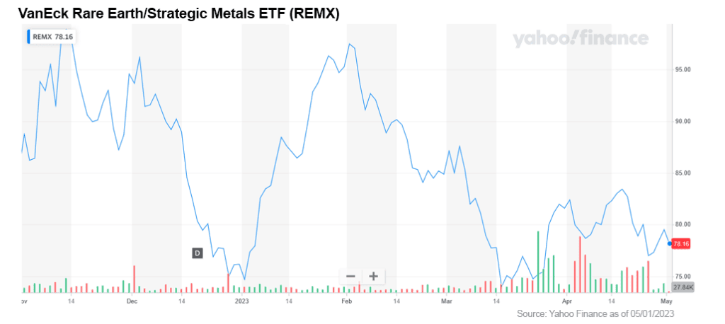 An easy way is through the strategic metals exchange-traded fund, VanEck Vectors Rare Earth/Strategic Metals ETF (NYSE: REMX). This is a basket of companies involved in strategic metals and rare earths with a fair amount of exposure to Chinese companies.
