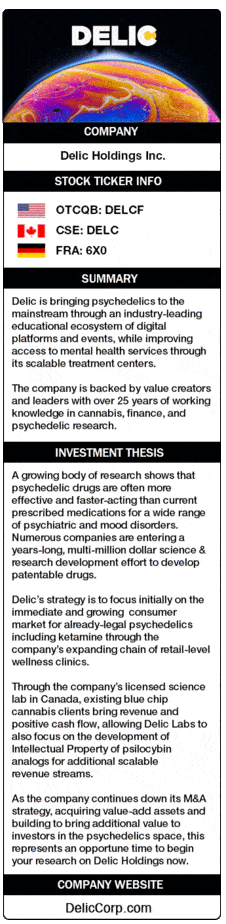A robust business model building out a delivery framework across multiple health and wellness clinics across America could catapult Delic (OTCQB: DELCF / CSE: DELC) to new heights by providing additional drug therapies beyond ketamine, once additional psychedelic drugs are eventually made legal.